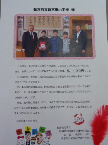 本校では、12月に赤い羽根共同募金に取り組み、たくさんの方からご支援いただきました。今年度は、8190円の募金をいただきました。今後、子どもたち、高齢者、障がい者などを支援するさまざまな福祉活動や災害時支援に役立てられます。地域のみなさん、保護者のみなさん、全校のみなさんありがとうございました。
