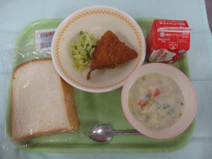 ワンローフパン 牛乳 あじフライ 一食中濃ソース ゆで野菜 白菜のクリーム煮