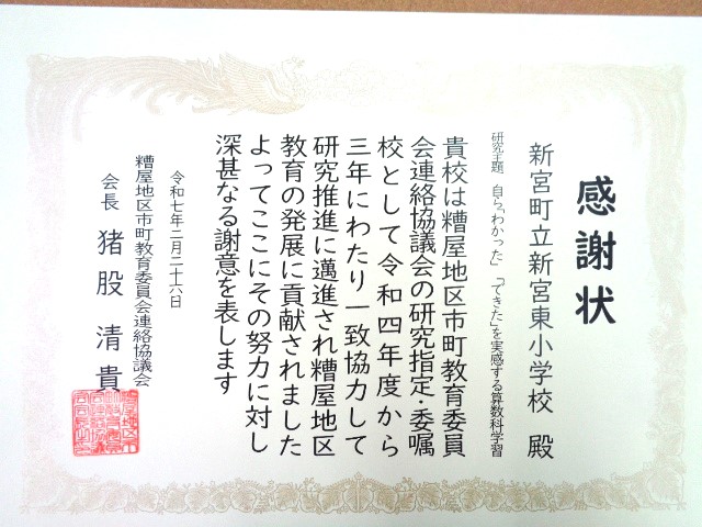 先日、去る10月4日に実施された研究発表会の成功や令和4年度から3カ年で授業改善に取り組んだ先生方のご努力、そして何よりも子ども達のがんばりに対して感謝状をいただきました。ありがとうございました。PTCAの役員の皆様や保護者の皆様、地域の皆様のご支援のおかげです。ありがとうございました。