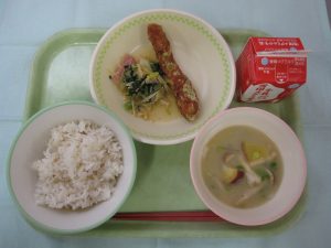麦ごはん 牛乳 竹輪の磯辺揚げ こまつなサラダ さつまいものみそ汁